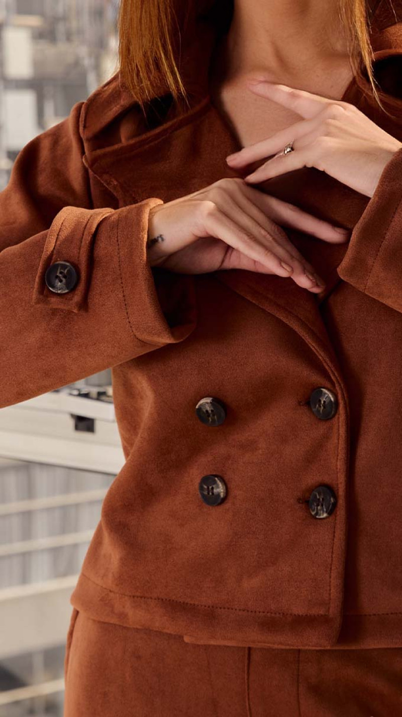 Essa peça traz uma proposta mais sofisticada, com toque diferenciado e construção que valoriza o visual. O comprimento cropped combinado com o efeito suede cria um equilíbrio entre elegância e modernidade.