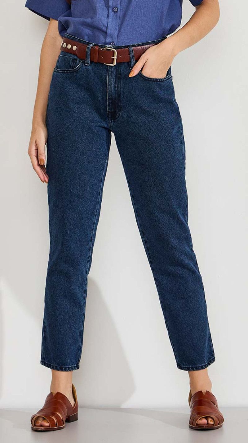 Calça jeans de modelagem mom que se destaca pelo tom azul escuro clássico, trazendo um estilo atemporal e versátil. Com seu cós alto, corte reto e caimento confortável, ela valoriza a silhueta ao mesmo tempo em que oferece liberdade de movimento, tornando-se uma peça essencial para compor looks casuais e cheios de personalidade.