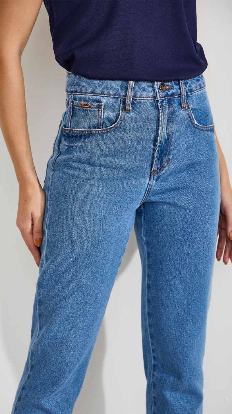 Calça jeans de modelagem mom que combina o conforto de um corte reto e solto nas pernas com um estilo vintage atemporal, destacando a cintura alta e a lavagem média que a tornam uma peça versátil e essencial para criar looks descontraídos e cheios de personalidade.