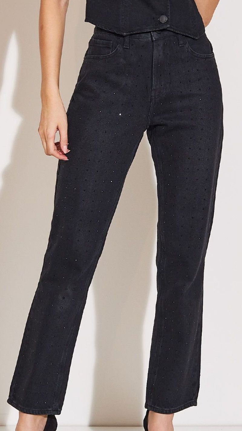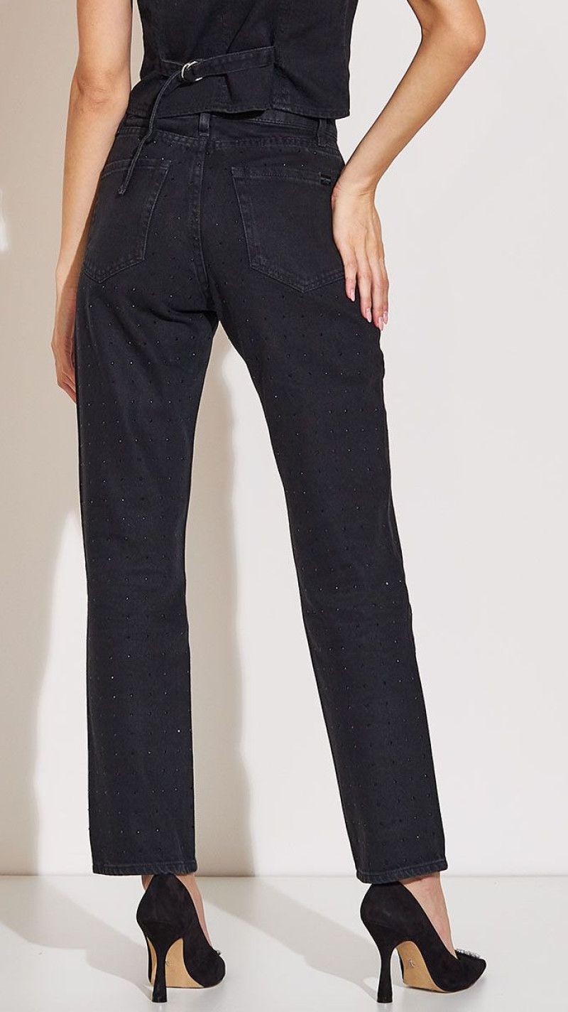 Esta peça versátil combina o conforto clássico do jeans com um toque de brilho refinado, graças aos detalhes em strass cuidadosamente aplicados por toda calça.