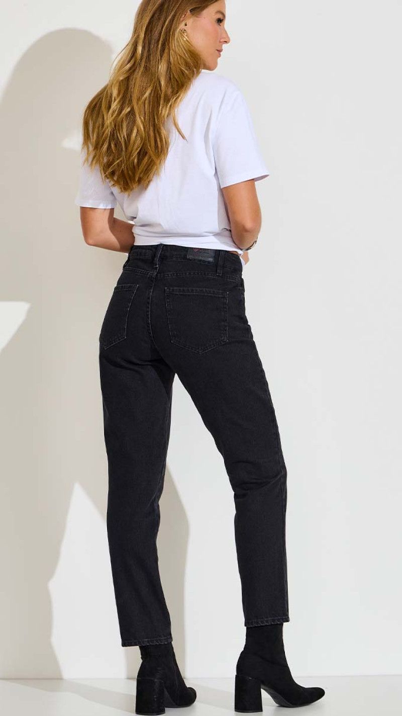 A Calça Jeans Mom Cintura Alta Preta combina o estilo retrô com uma atitude atual e cheia de personalidade. Com cintura alta e modelagem confortável, ela oferece um caimento que valoriza a silhueta e traz um toque despojado para o visual.