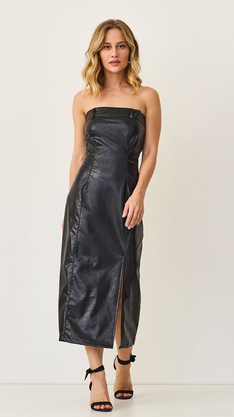 Esta peça única combina a sofisticação atemporal do corte midi com a ousadia e a textura luxuosa do couro. Com detalhes cuidadosamente elaborados e um ajuste impecável, este vestido é perfeito para ocasiões especiais ou para adicionar um toque de glamour ao seu visual diário.