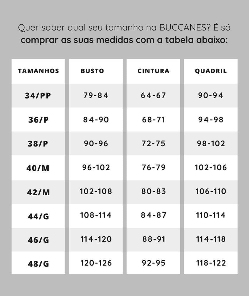 Modelo veste 36 | PP     Altura: 1,73m/ Busto: 84cm/ Cintura: 62cm/ Quadril: 91cm.