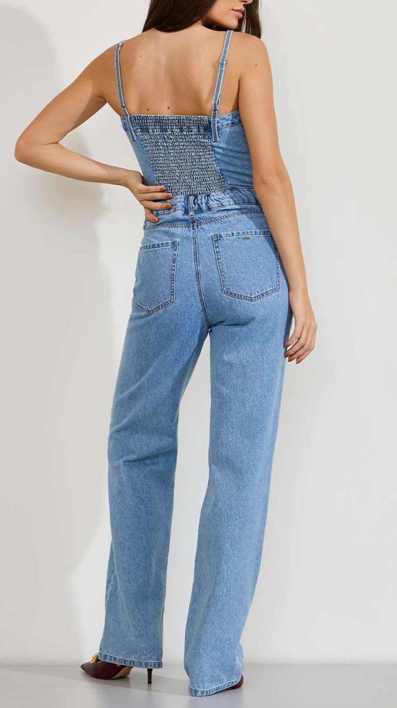 Confeccionado em denim 100% algodão, ele traz um visual moderno com cintura marcada por lastex nas costas, garantindo conforto e ajuste perfeito ao corpo. Os botões encapados e os detalhes de alfaiataria deixam o design ainda mais sofisticado, enquanto a modelagem reta proporciona caimento elegante e atemporal.