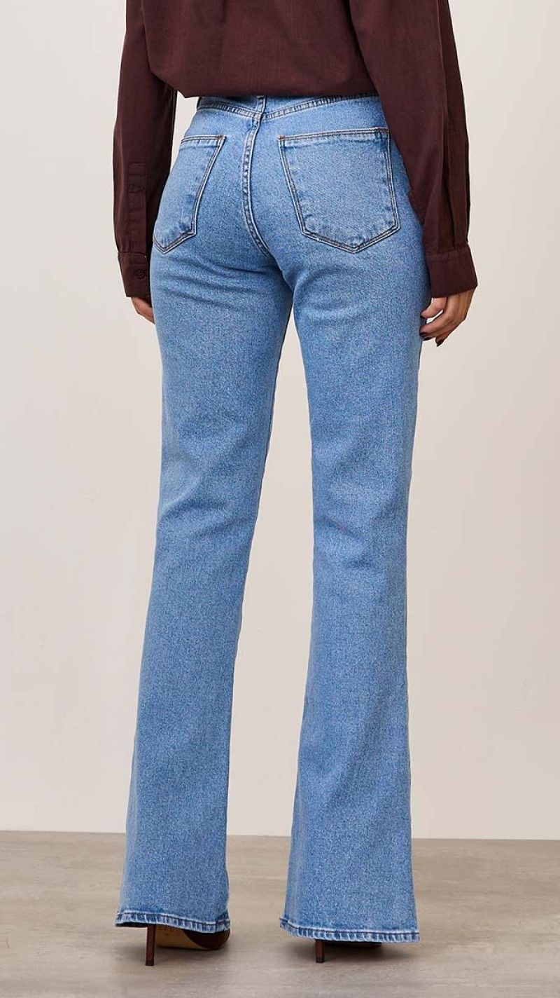 A calça flare valoriza a silhueta com um caimento ajustado até o joelho e abertura suave na barra, criando um efeito alongador elegante. O detalhe diferenciado no bolso relógio traz personalidade ao clássico jeans, enquanto a estrutura da cintura garante encaixe seguro e confortável. Uma peça versátil que equilibra atitude e feminilidade na medida certa.