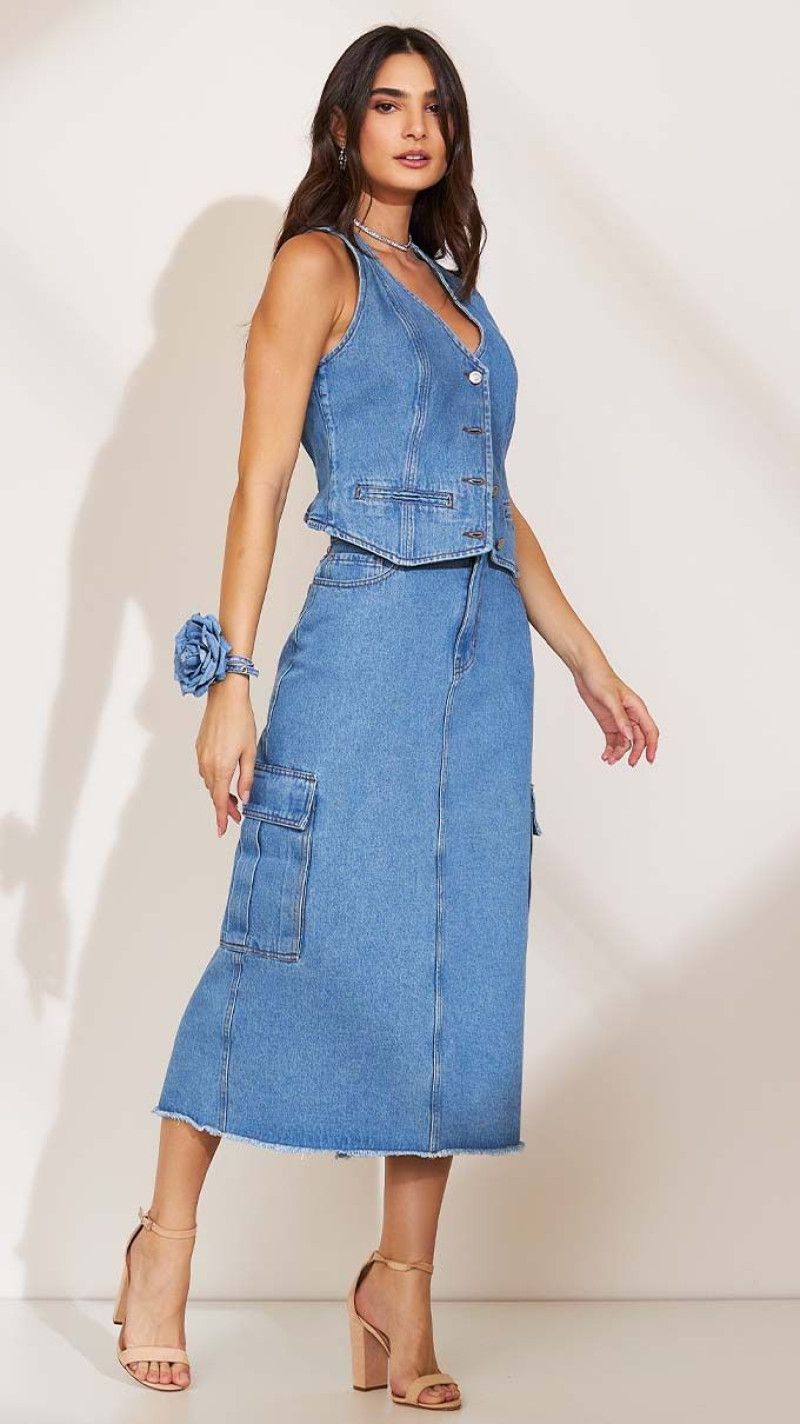 O colete jeans é versátil e atemporal. Ele é uma versão sem mangas da clássica jaqueta jeans, o que o torna uma opção perfeita para adicionar estilo e personalidade aos seus looks, além de um adicionar um charme quando você sente que o look está faltando um toque especial.