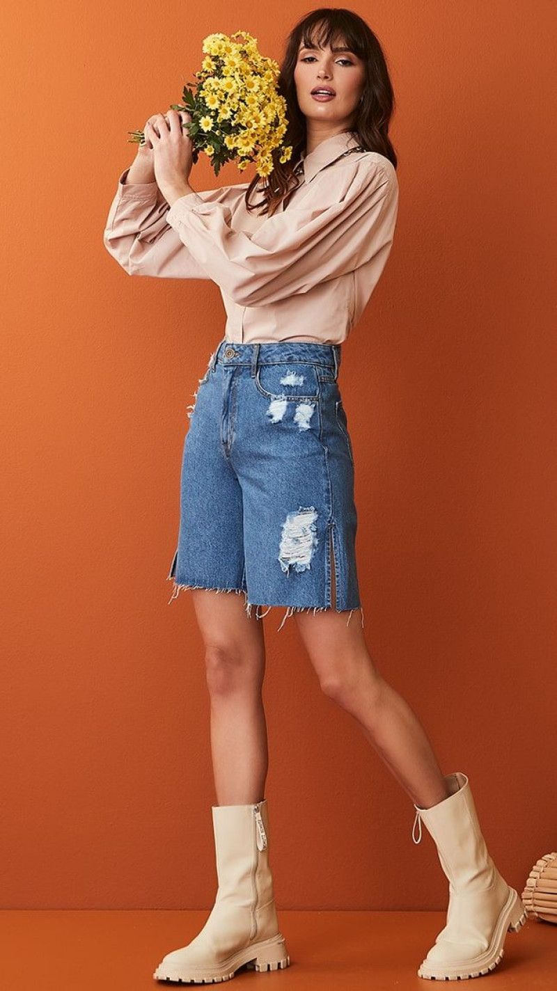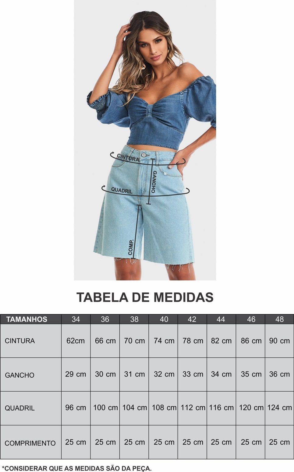 BERMUDA WIDE é super tendência e vai com tudo. Feita em jeans 100%, ou seja, vai adquirir uma peça com muita durabilidade. Possui shape mais soltinho e comprimento até o joelho.