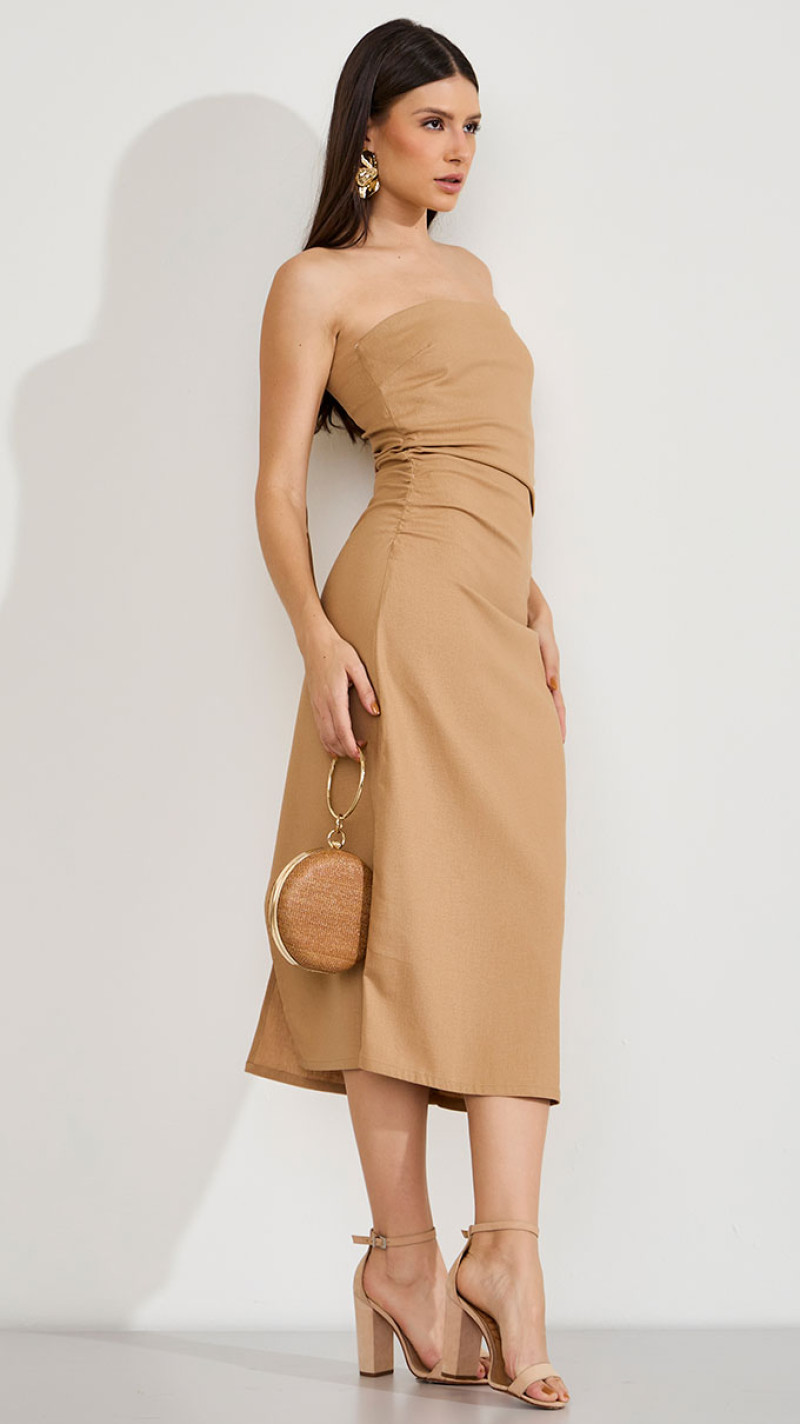 Confeccionado em tecido com toque de linho, ele apresenta uma modelagem tomara que caia com leve franzido lateral, que valoriza a silhueta e garante um caimento elegante. O comprimento midi equilibra sofisticação e modernidade, enquanto o zíper invisível nas costas mantém o acabamento limpo e delicado.