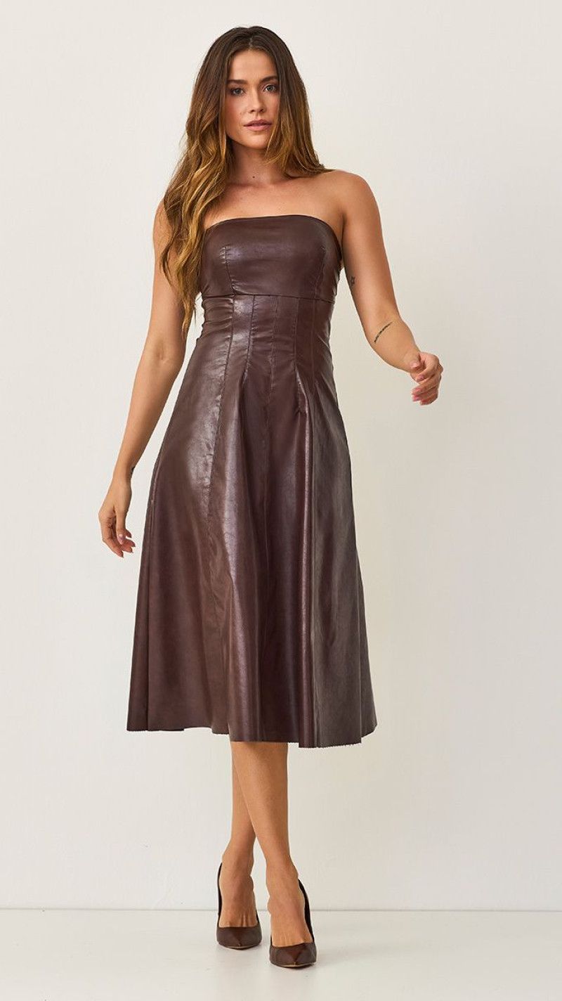 VESTIDO MIDI GODÊ STRAPLESS COURO COFFEE