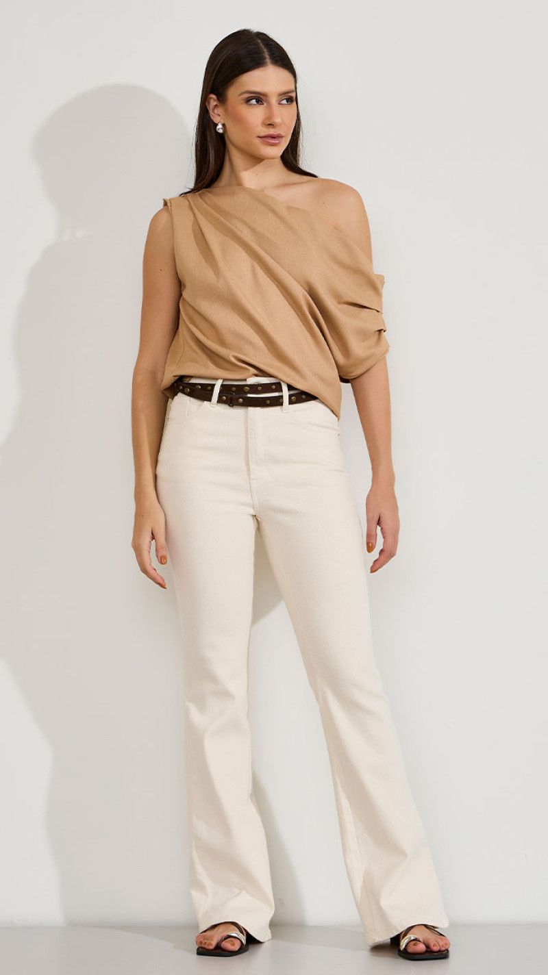 Com um design assimétrico e cheio de personalidade, esta blusa une modernidade e leveza em uma peça elegante e versátil. O ombro único com pregas delicadas valoriza a silhueta e traz um toque sofisticado ao visual, enquanto o tecido de linho com viscose oferece conforto e um caimento fluido. Ideal para composições que transitam do casual chic ao sofisticado com facilidade.