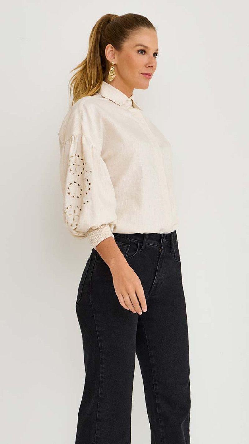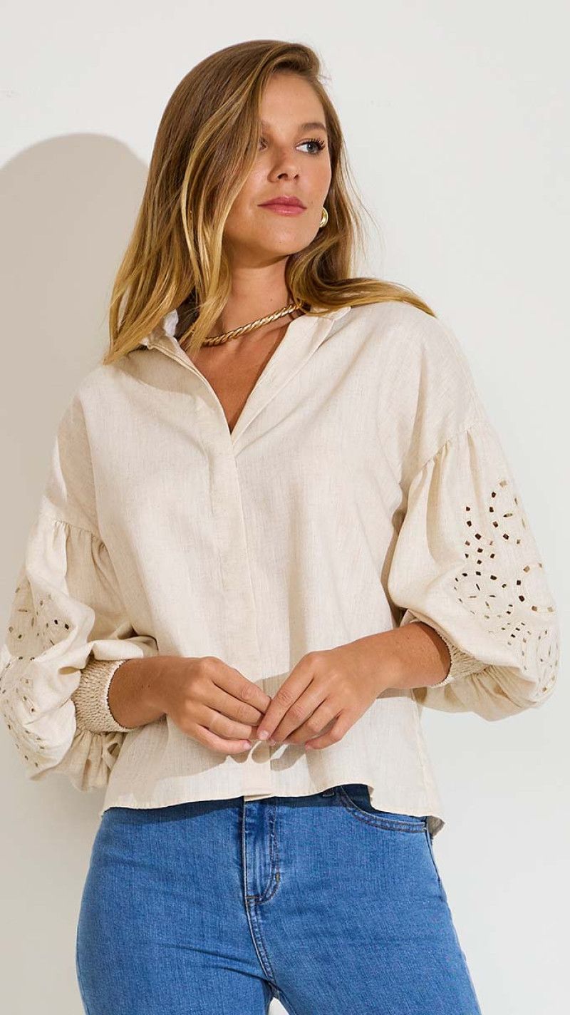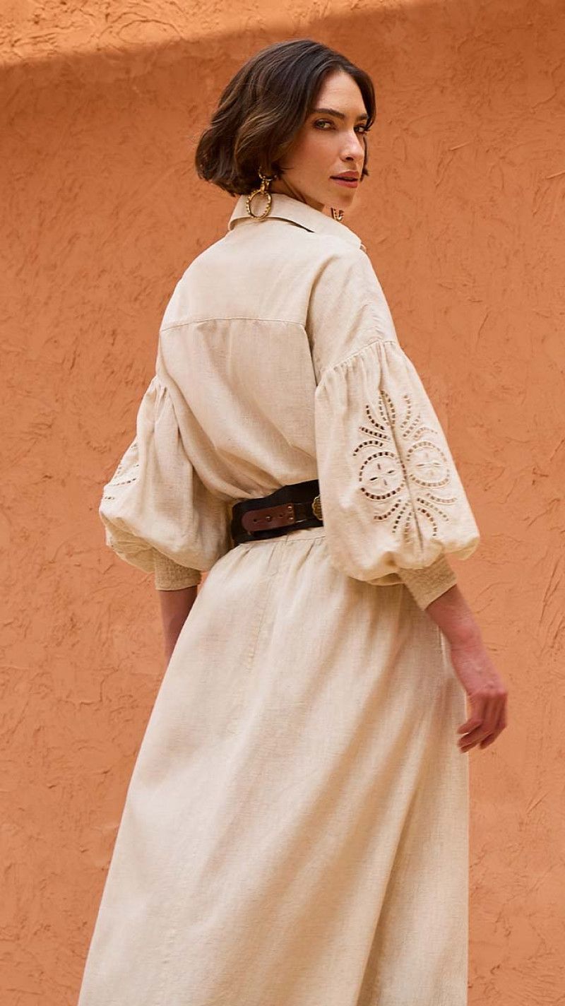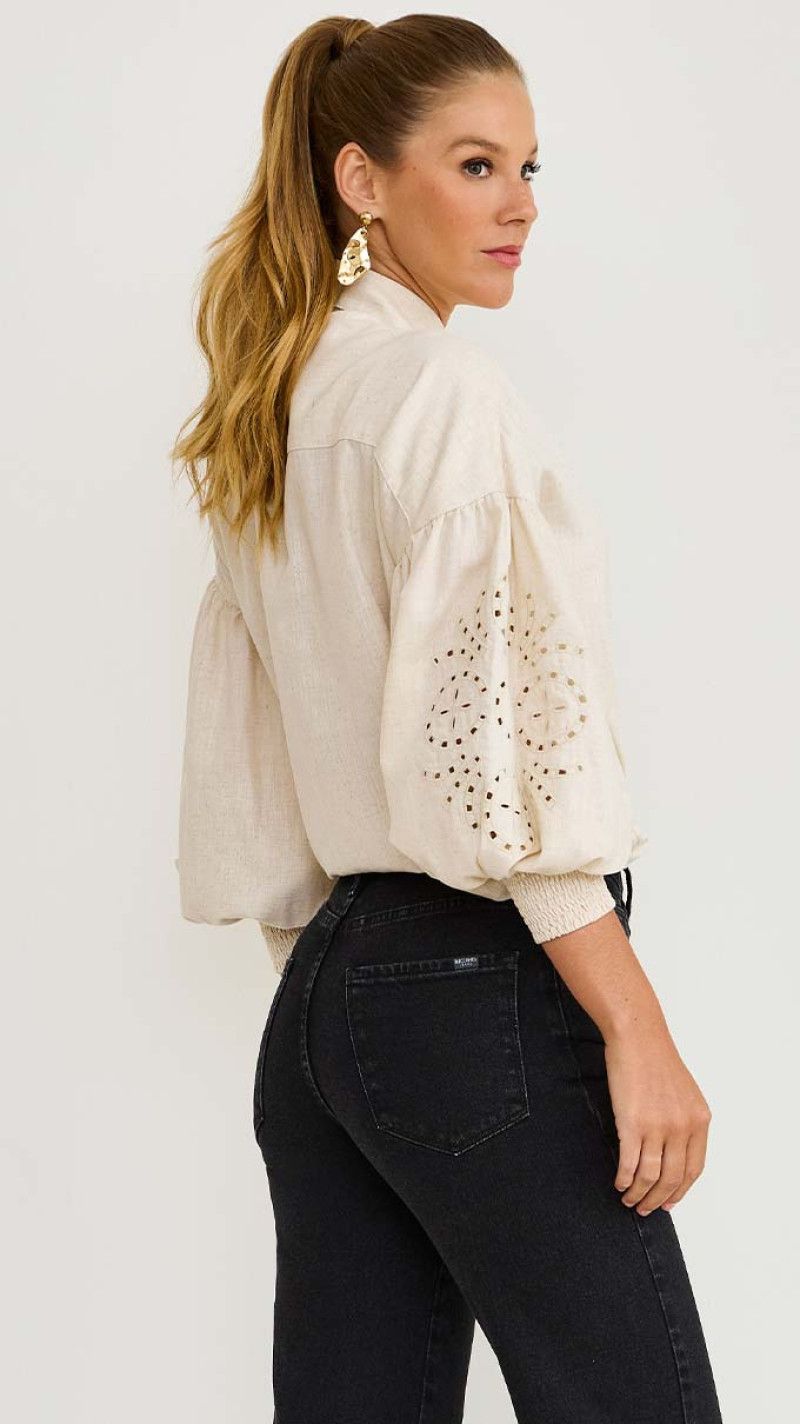 Confeccionada em tecido natural, esta camisa une sofisticação e leveza em uma peça atemporal. O destaque fica por conta das mangas bufantes com delicado bordado vazado, que adiciona um toque artesanal e feminino ao visual. Possui abotoamento frontal oculto, garantindo um acabamento mais clean e elegante. Versátil, pode ser usada tanto em produções casuais quanto em composições mais refinadas.
