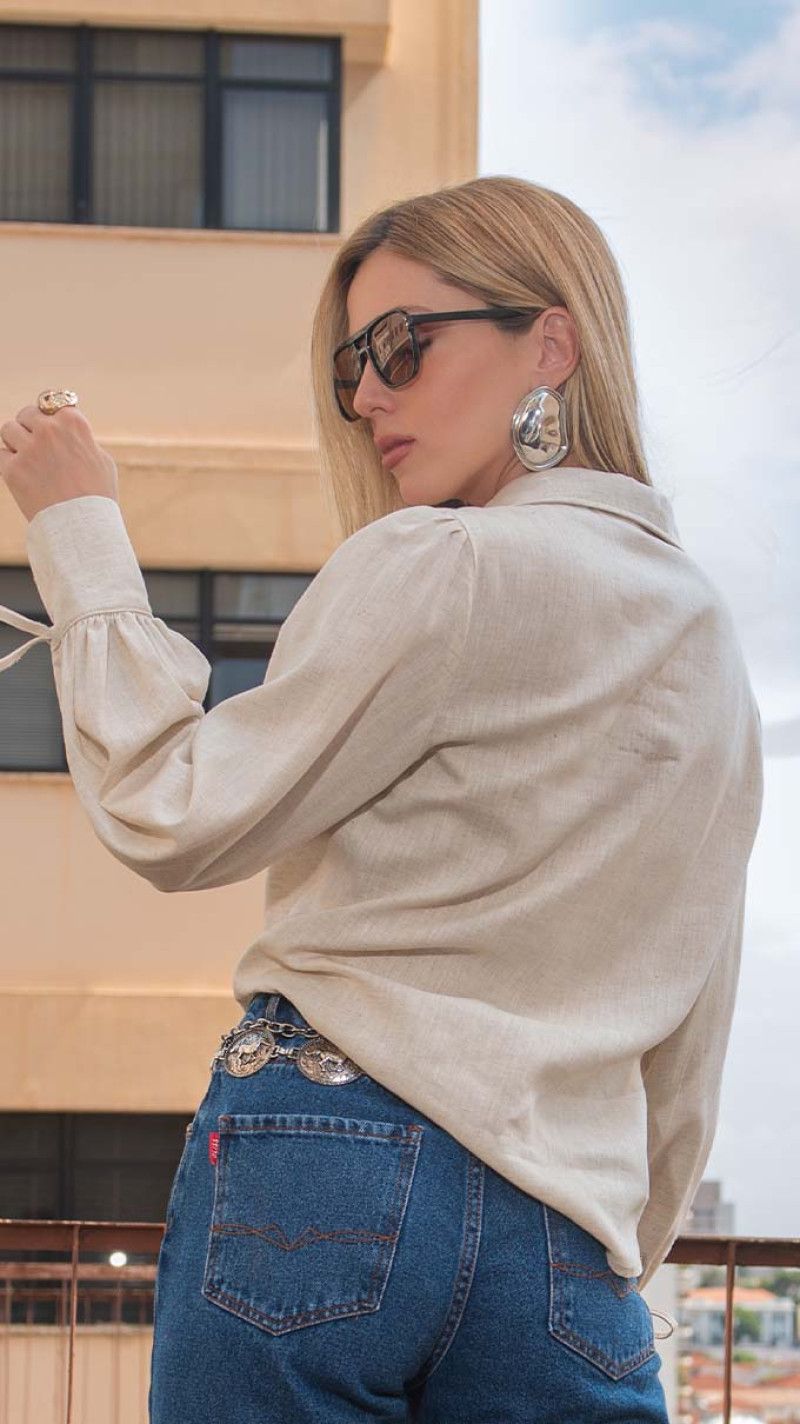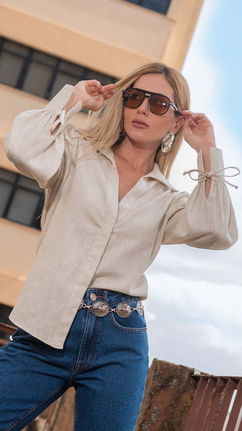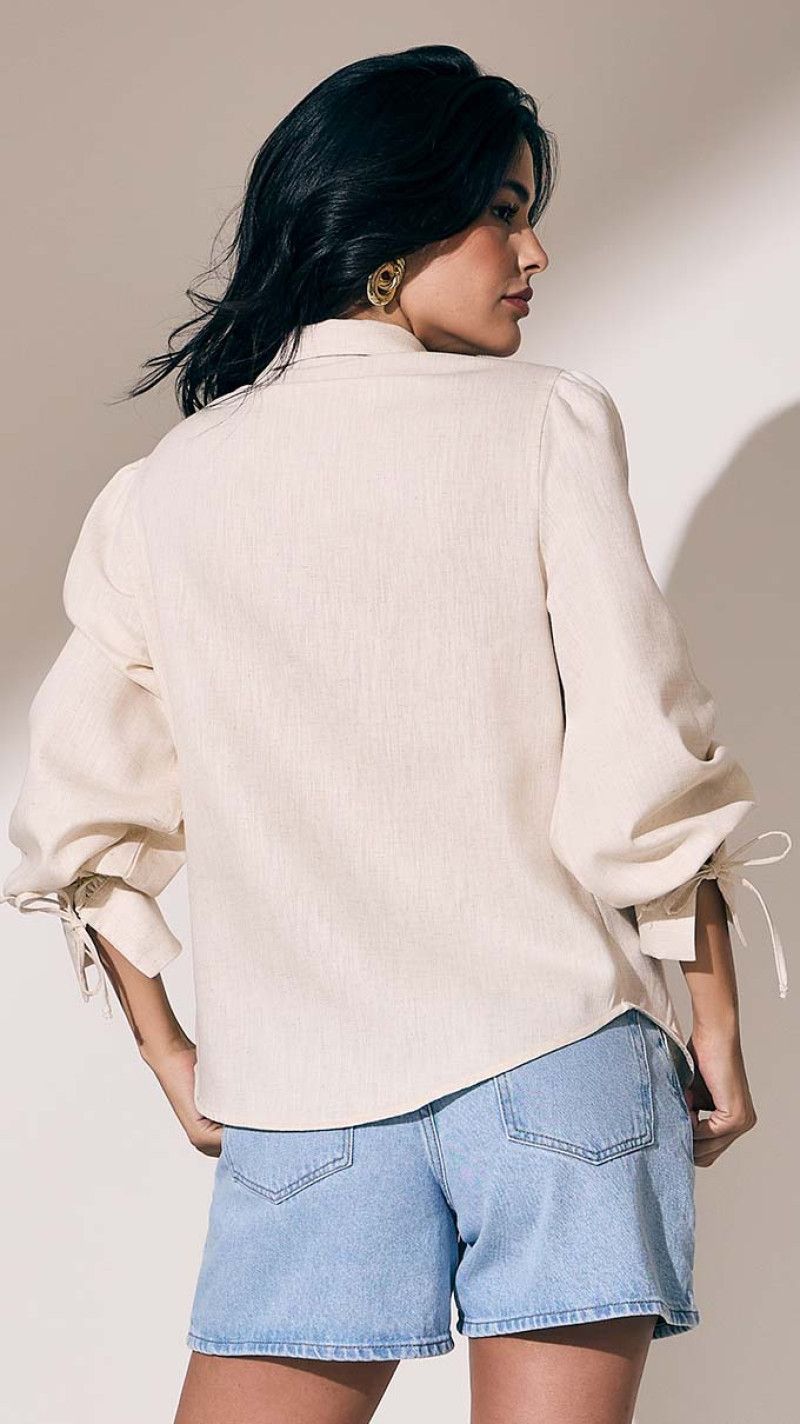 Sinta a delicadezae a textura natural do linho nesta camisa elegante. O design cuidadosamente elaborado apresenta mangas com um sutil franzido, e punhos com detalhe dos laços delicados, conferindo um visual sofisticado e feminino. Ideal para quem busca peças atemporais com um toque especial.