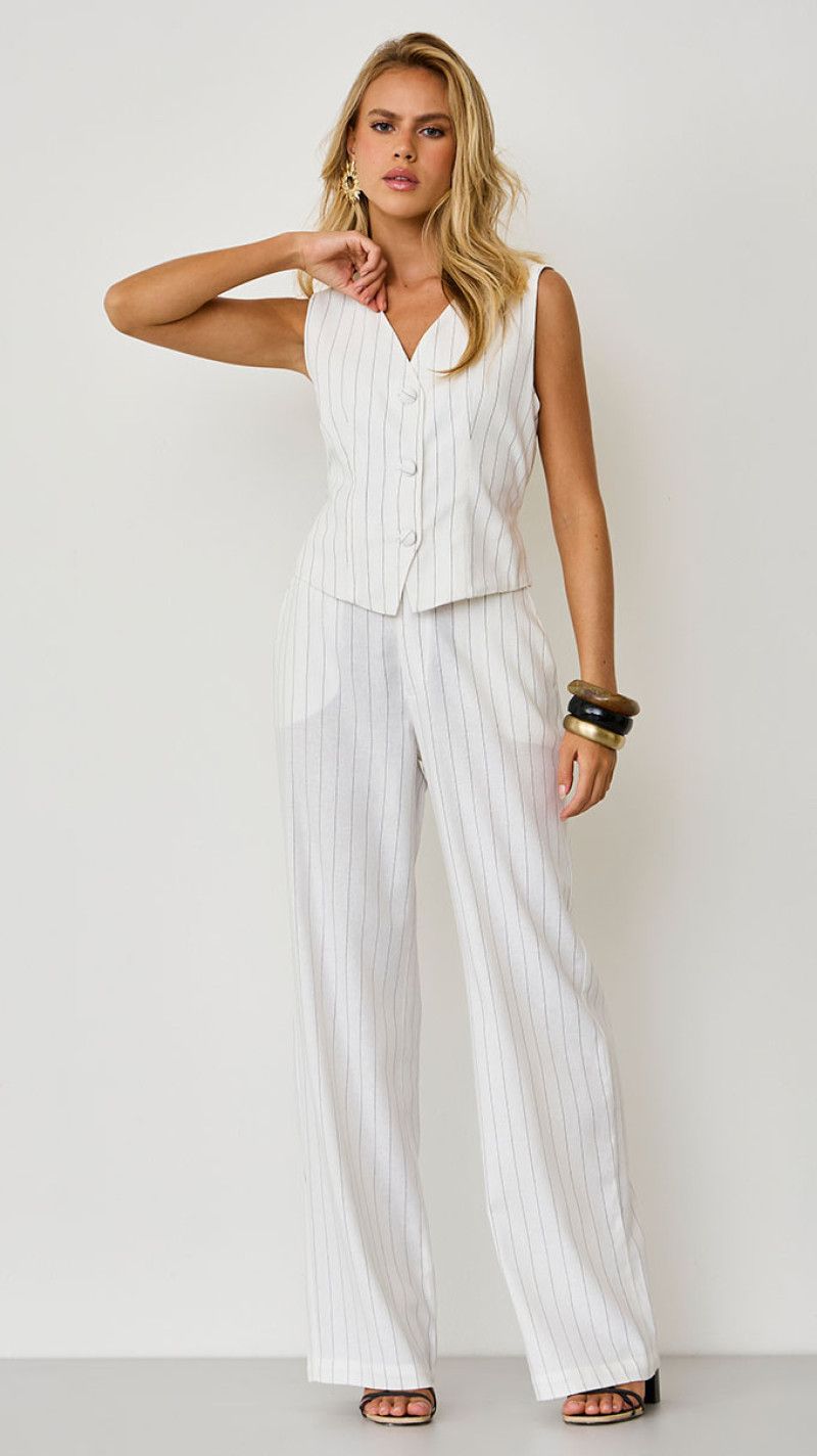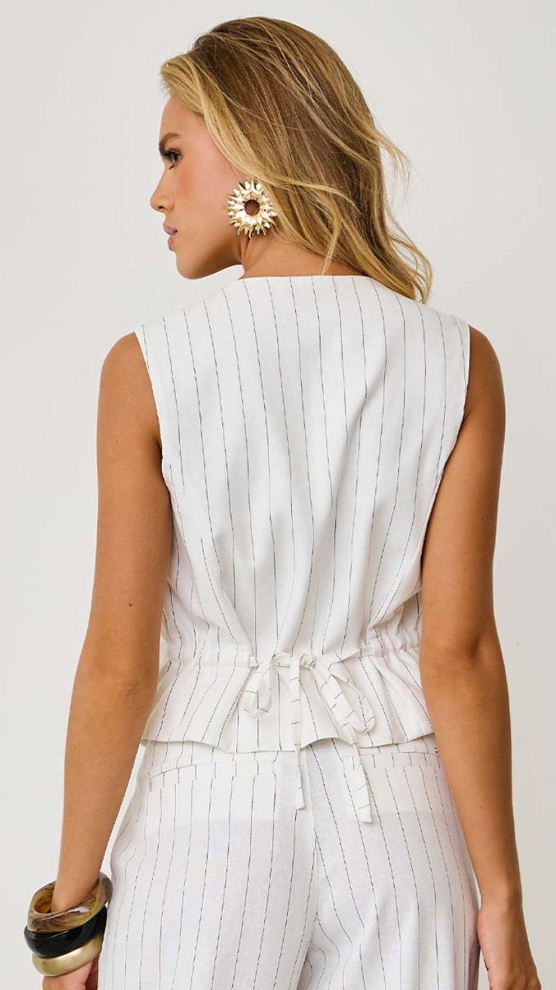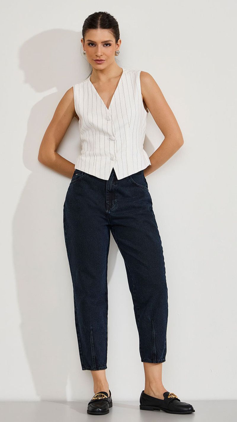 O colete em linho com risca de giz traz aquele toque sofisticado e atual que transforma qualquer combinação. A modelagem estruturada valoriza a silhueta, enquanto o ajuste nas costas permite um caimento mais definido conforme o gosto de quem veste. As listras finas reforçam o visual refinado, fazendo dele uma peça versátil perfeita tanto para composições mais clássicas quanto para produções modernas.