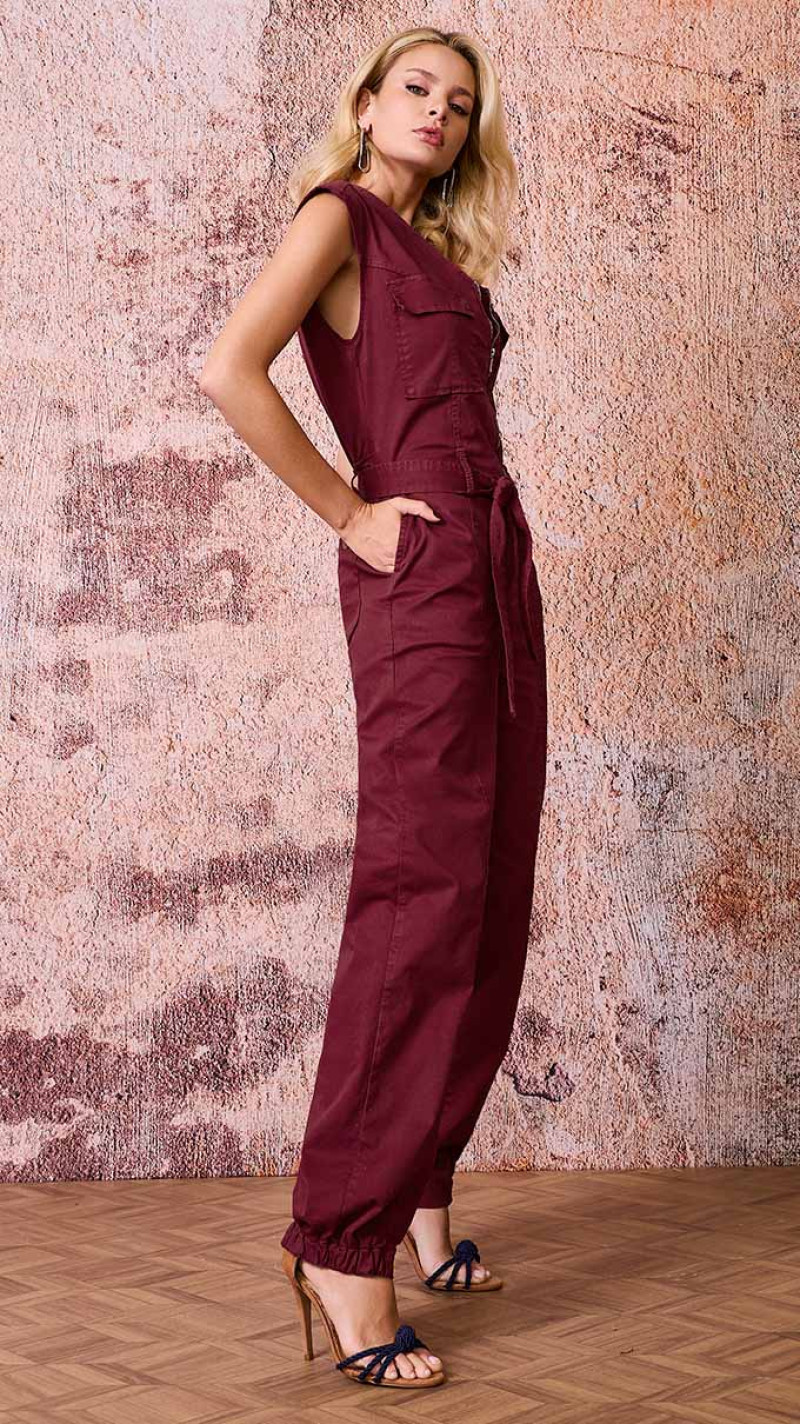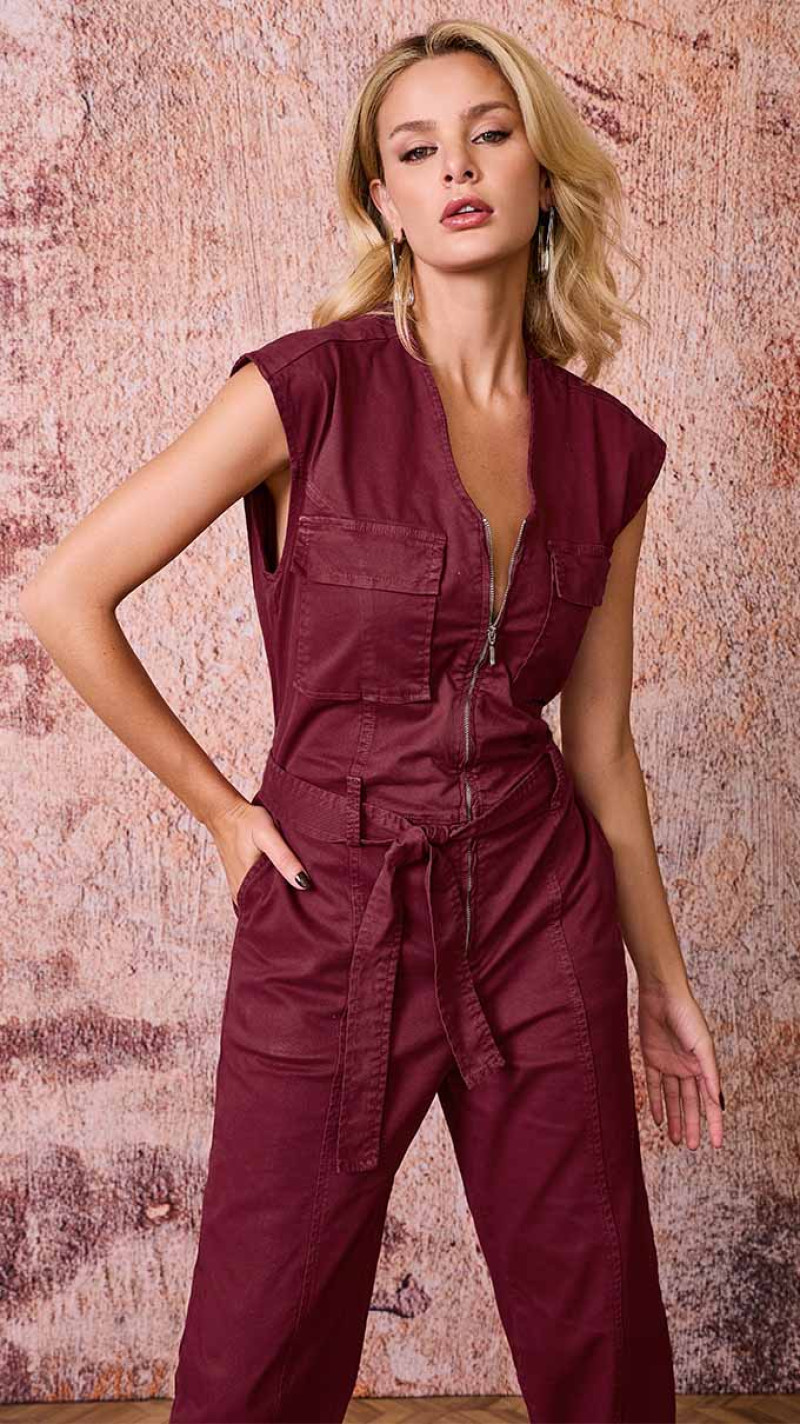 O macacão traz uma proposta utilitária com toque moderno e versátil. O decote com lapela e zíper frontal cria um visual marcante, enquanto a faixa para amarração valoriza a cintura e permite ajustar o caimento ao corpo. A barra com elástico adiciona personalidade e conforto, equilibrando estrutura e movimento em uma peça única que resolve a produção com facilidade.