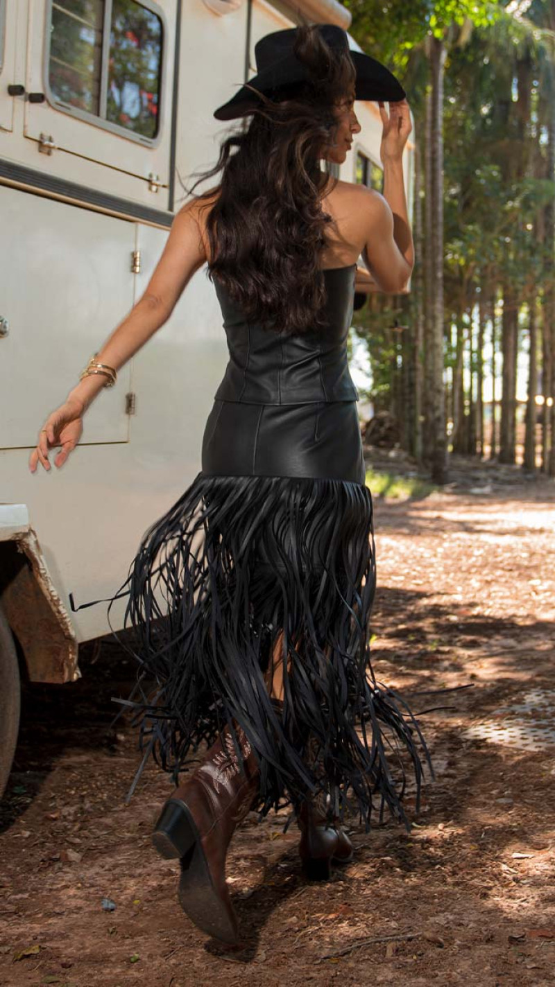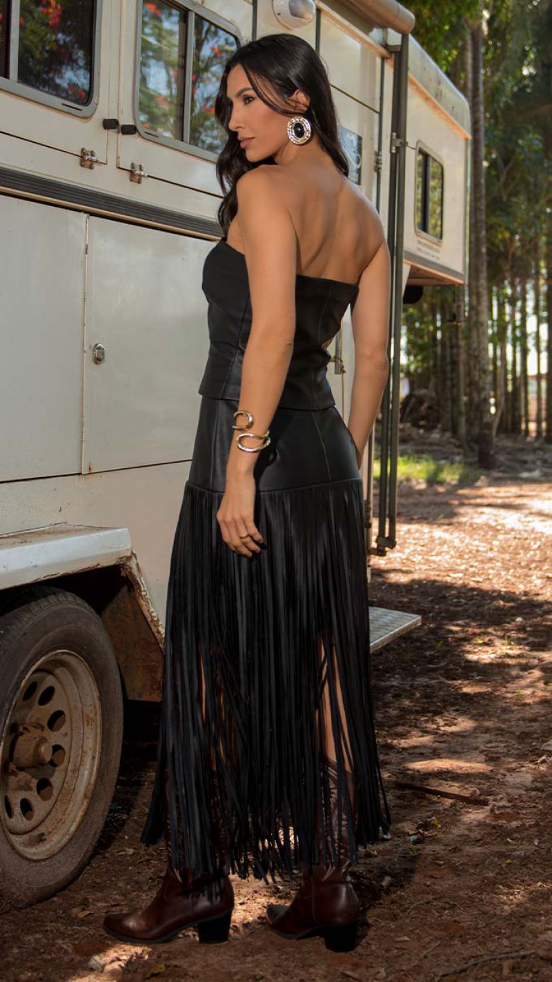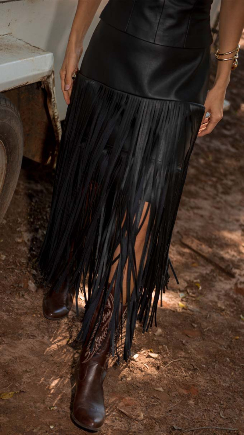 Essa peça traz uma proposta marcante, com textura imponente e movimento que transforma o visual. O neo couro combinado com as franjas cria um efeito dinâmico, que valoriza cada passo e entrega presença com personalidade.
