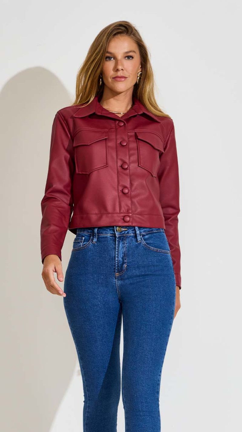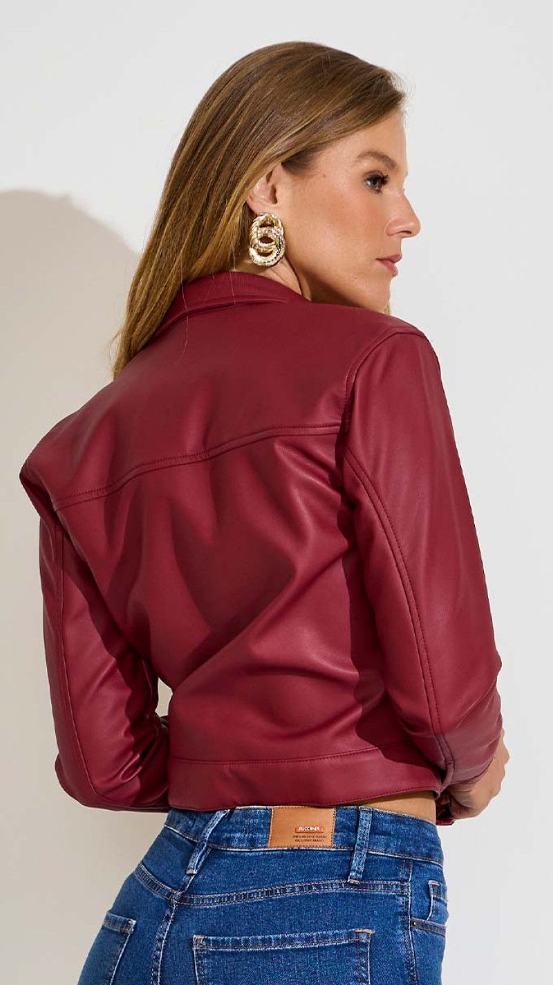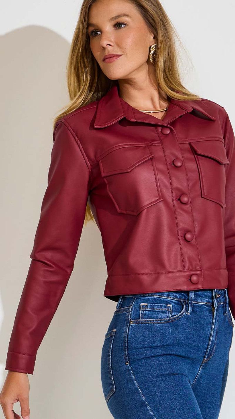 Shacket Cropped em couro, extremamente estilosa, com um brilho incrível e que combina muito bem com um visual moderno e elegante. Prática e versátil, pode ser usada poara compor looks para o dia ou para a noite.