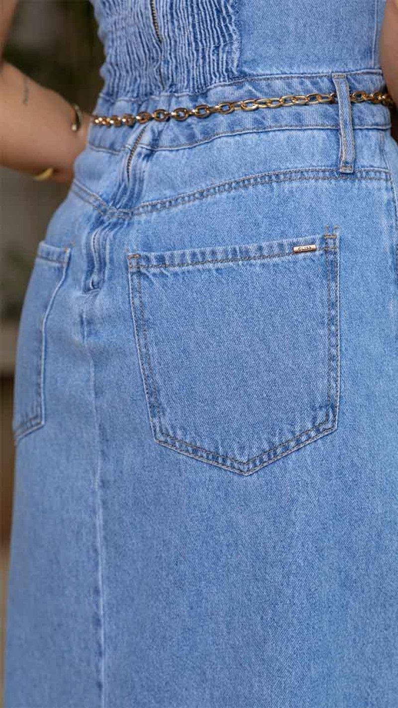 O vestido midi em denim leve combina charme e modernidade em uma única peça. O busto ajustado com alças finas valoriza o colo, enquanto a saia com fenda frontal traz movimento e um toque de atitude na medida certa. As costas com lastex garantem conforto sem perder a forma, criando um visual que abraça o corpo com suavidade. Um modelo versátil, atual e perfeito para quem gosta de peças que unem presença e leveza com naturalidade.